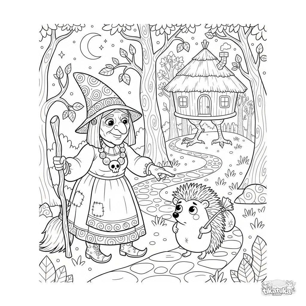 Ausmalbild nach einem russischen Märchen für Kinder 7-12: Baba Jaga gibt einem verlorenen Igel in der Dämmerung den Weg, ihre Hütte auf Hühnerbeinen im Hintergrund. Detaillierte Szene.