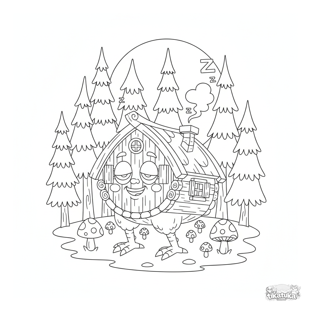 Ausmalbild für ältere Kinder von 7-12 Jahren: Baba Yagas berühmte Hütte auf Hühnerbeinen macht ein Nickerchen in einem mondbeschienenen Wald, schnarcht Rauchringe, umgeben von leuchtenden Pilzen.