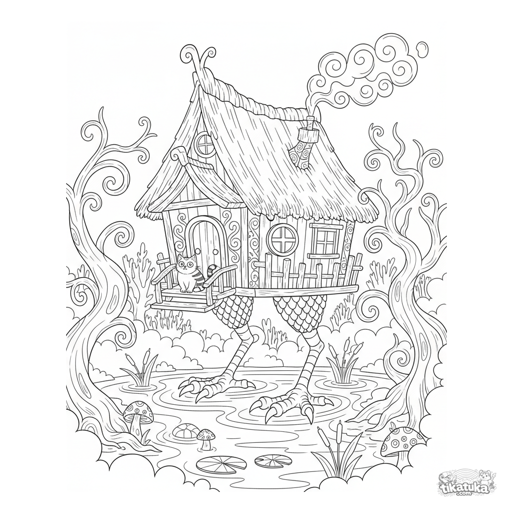 Ausmalbild aus einem russischen Märchen: Baba Yagas Hütte auf Hühnerbeinen in einem Sumpf. Für Kinder von 7-12 Jahren. Dämmerung, Nebel, krumme Bäume und eine Katze.