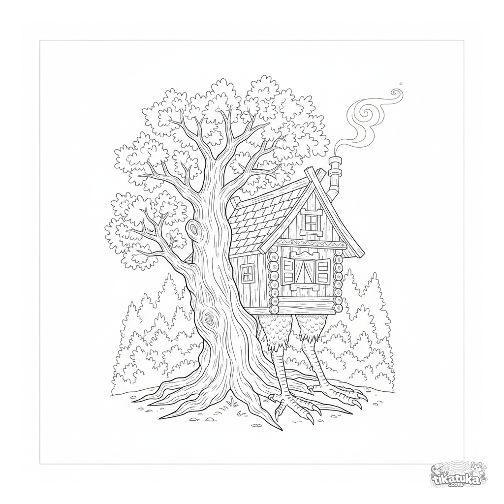 Ausmalbild für Kinder 7-12: die berühmte Hütte der Baba Yaga auf Hühnerbeinen lugt hinter einer alten Eiche im dunklen Wald hervor. Detaillierte mystische Szene mit Kaminrauch.