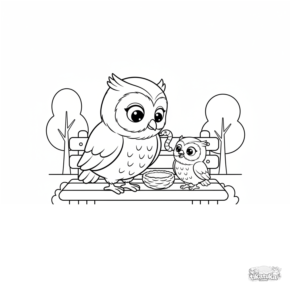 Sehr einfaches Ausmalbild für Kleinkinder 2-3: Eine freundliche Eule füttert einen winzigen Jungvogel auf einer Parkbank. Große, klare Formen.