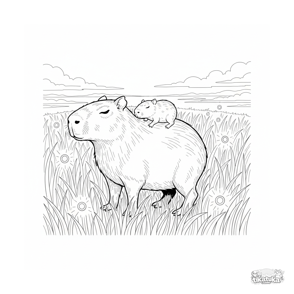 Detailliertes naturalistisches Ausmalbild für 10-12 Jahre: Ein Capybara-Elternteil mit einem Baby auf dem Rücken auf einem Feld bei Sonnenuntergang. Anatomisch genaue Umrisse, Szene der Familienbindung.