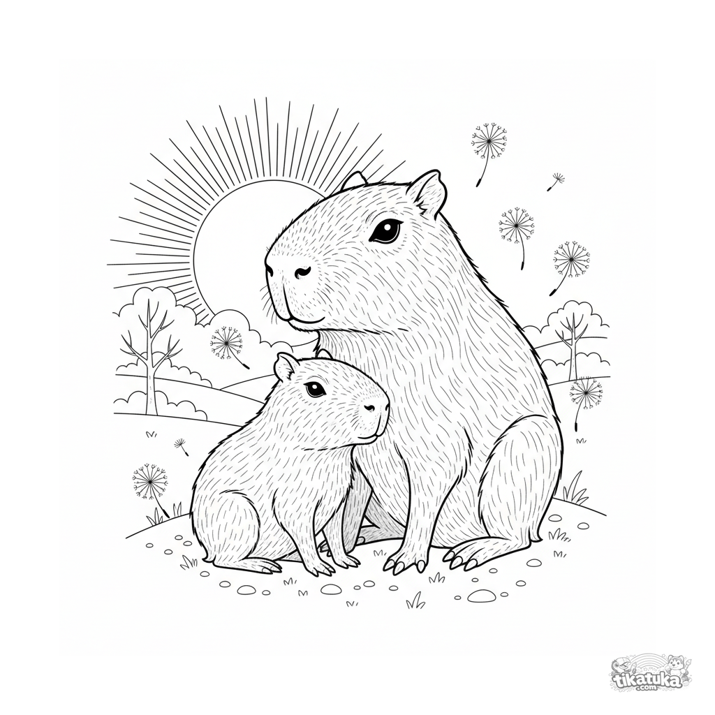 Detailliertes Ausmalbild für Kinder 10-12: Eine Capybara-Familie an einem Hang beobachtet den Sonnenuntergang. Realistische Darstellung eines Babys und eines Elternteils in friedlicher Umgebung.