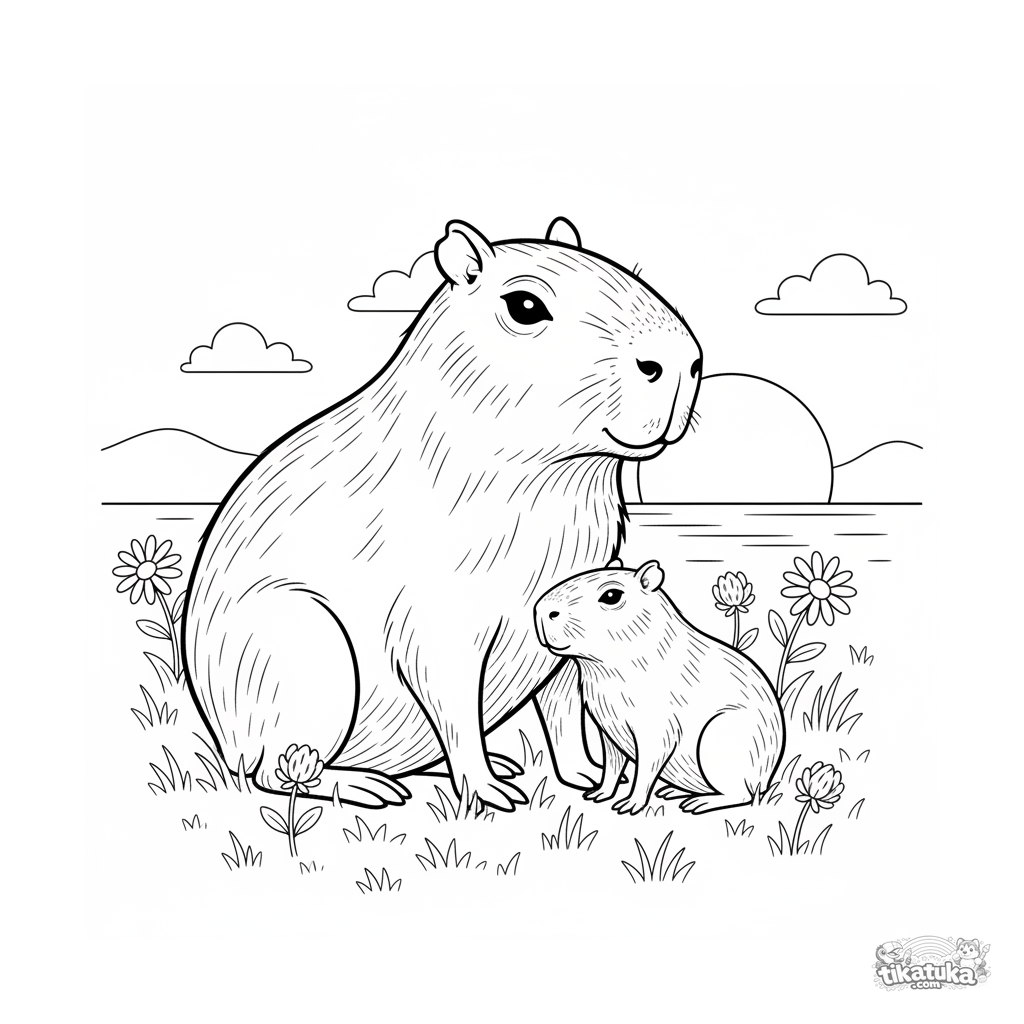 Ausmalbild für Kinder 4-6 Jahre: Ein Capybara-Elternteil und Baby beobachten friedlich den Sonnenuntergang auf einer Wiese. Einfache Formen, Szene der Zärtlichkeit.