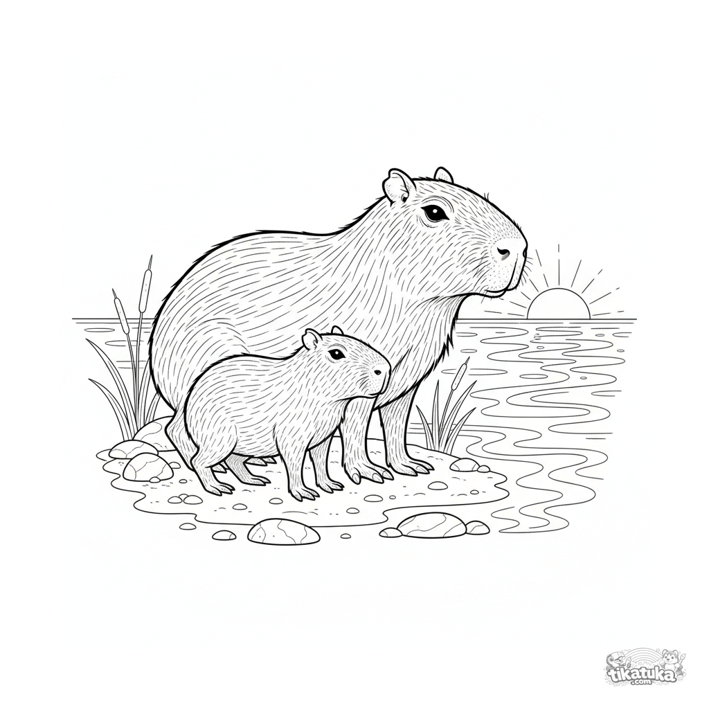 Detailliertes Ausmalbild für Kinder von 10-12 Jahren: Ein erwachsenes Capybara und ein Baby beobachten den Sonnenuntergang am Flussufer. Realistische Naturszene.