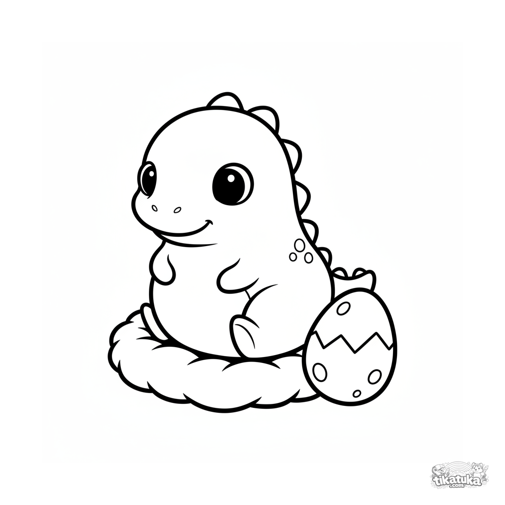 Ausmalbild für Kinder 2-3 Jahre: ein süßer, birnenförmiger Baby-Dinosaurier sitzt auf einem Kissen und betrachtet ein großes Ei. Glatte, weiche Konturen.