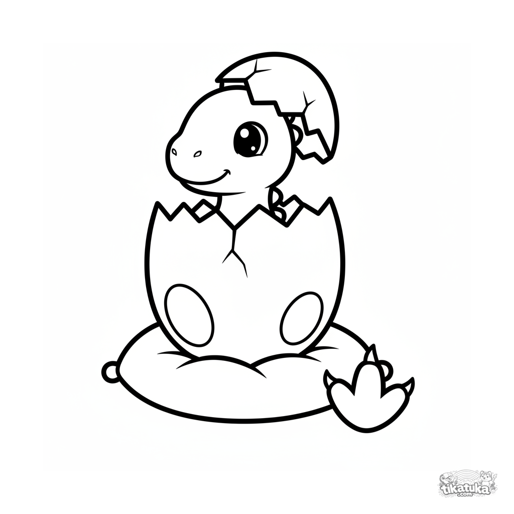 Malmalbild für die Allerkleinsten: ein Dinosaurier-Ei mit einem hervorschauenden Baby ruht auf einem Kissen. Einfache Formen, ein großer Fußabdruck daneben, breite Ränder zum Ausmalen.