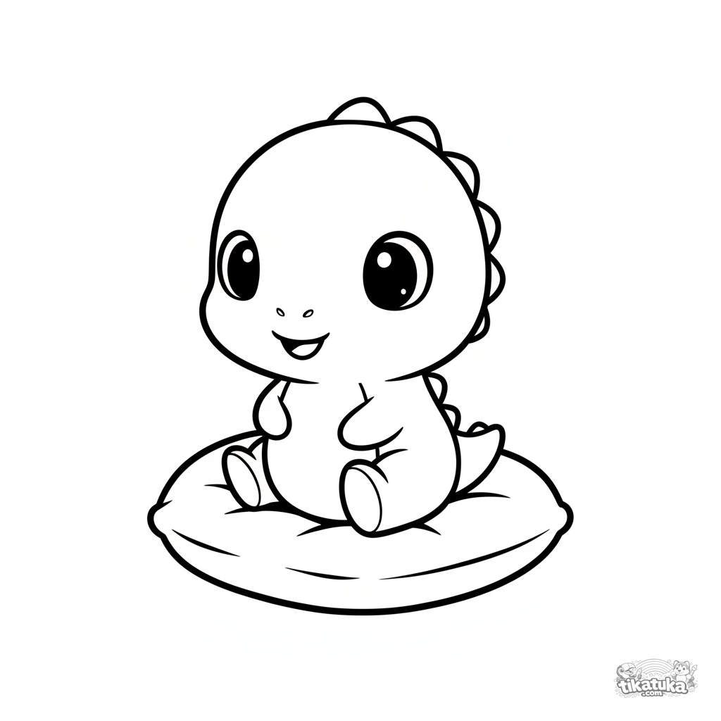 Ausmalbild für die Allerkleinsten: ein neugieriger Baby-Dinosaurier sitzt auf einem Kissen. Riesiger Kopf, einfache Formen.