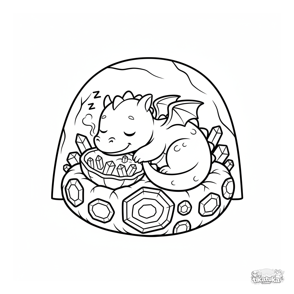 Ausmalbild für Kleinkinder 2-3: ein niedlicher Baby-Drache schläft in einem Nest aus funkelnden Kristallen. Einfache Szene mit großen Formen und breiten Rändern.