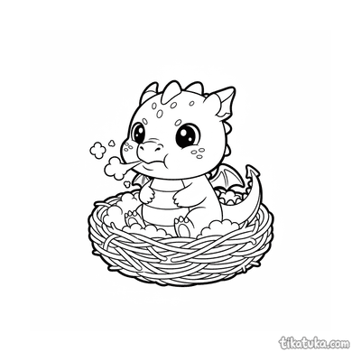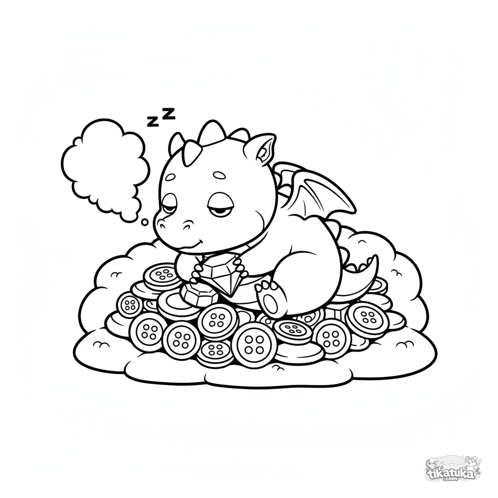 Einfaches Ausmalbild für Kleinkinder 2-3: Ein niedlicher Baby-Drache schläft auf einem Haufen glitzernder Kleinode. Große klare Formen, wenige Details.