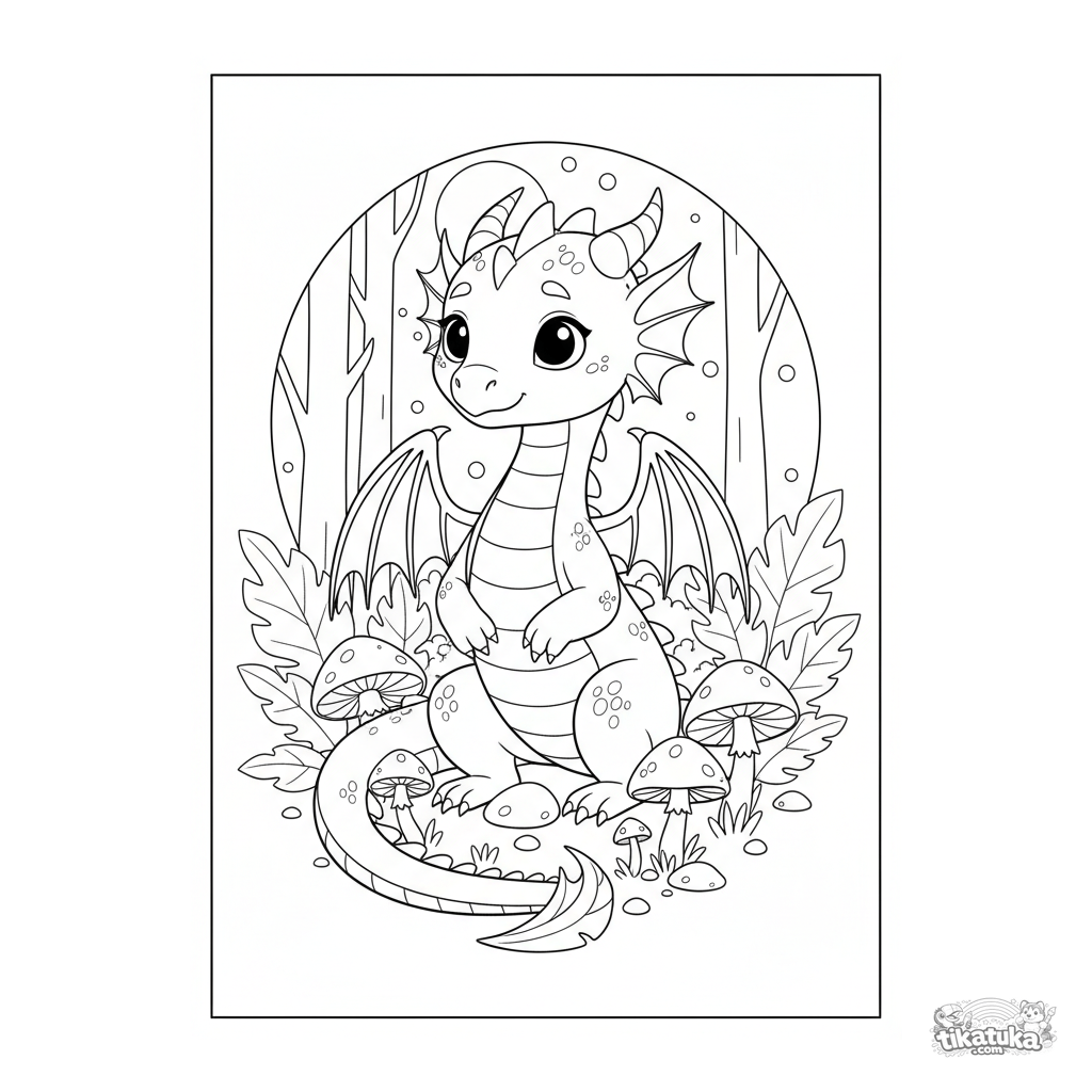 Ausmalbild für Kinder 7-12: ein kleiner Drache mit gefiederten Flügeln bewacht einen Ring leuchtender Pilze auf einer mondbeschienenen Waldlichtung.