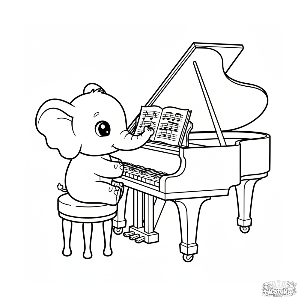 Einfaches Ausmalbild für Kleinkinder 2-3: Ein niedlicher Baby-Elefant erkundet einen großen Konzertflügel auf der Bühne.