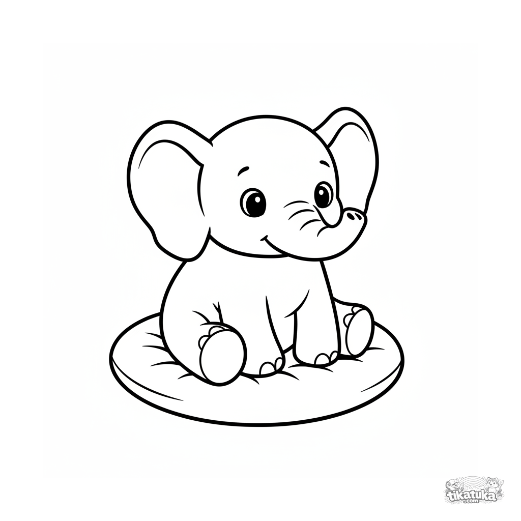 Ausmalbild für die Allerkleinsten: ein Plüsch-Babyelefant sitzt auf einem Kissen. Klare erkennbare Silhouette, einfache Linien, perfekt für die Motorik.