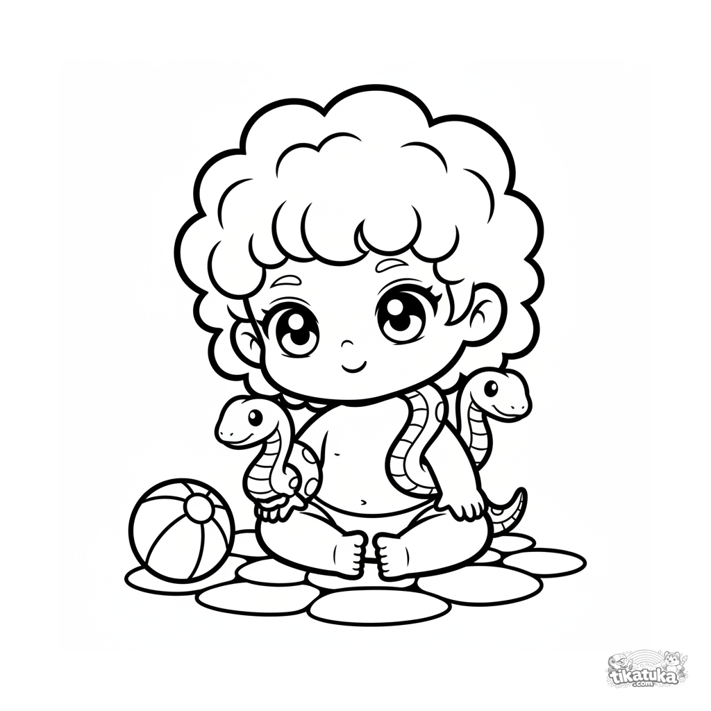 Ausmalbild für Kleinkinder 2-3: eine süße Baby-Gorgone in der Höhle spielt mit Schlangen. Einfache große Formen, wenige Details, perfekt für erste Buntstifte.