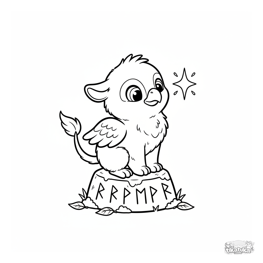 Malmalbild für Kleinkinder: ein flauschiges Baby-Greif sitzt auf einem alten Runenmonolithen. Einfache, große Formen mit breiten Rändern.