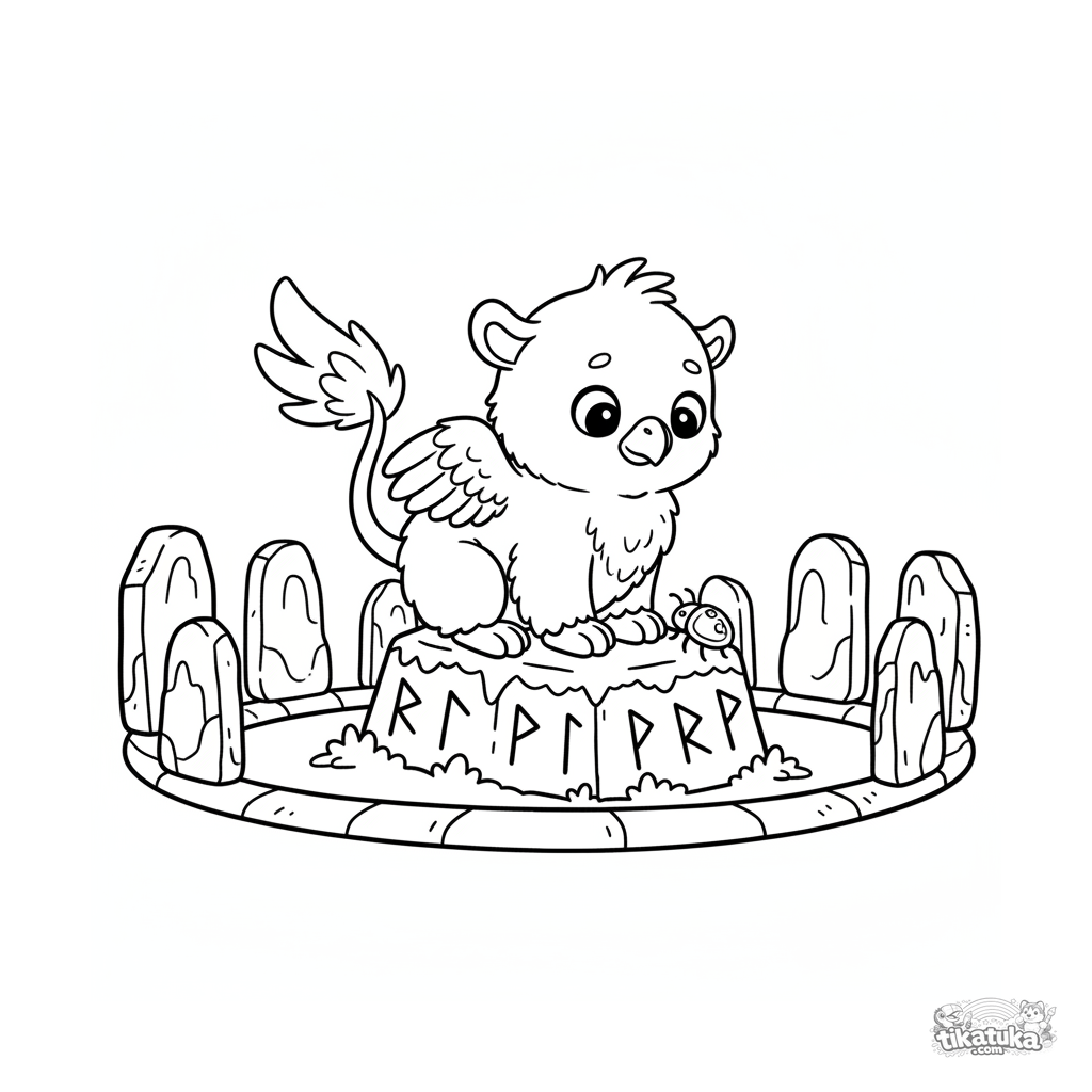 Ausmalbild für Kleinkinder: ein flauschiges Baby-Greif auf einem alten Runenstein. Einfache Linien, große Formen, perfekt für Kinder von 2-3 Jahren.