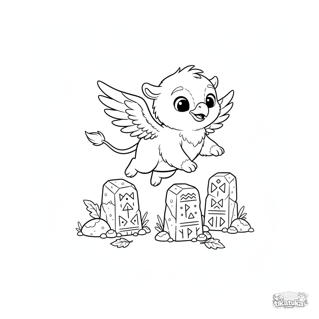 Ausmalbild eines Baby-Greifs, der zwischen alten Runensteinen spielt. Für Kinder von 4-6 Jahren. Mythisches Wesen in magischer Umgebung.