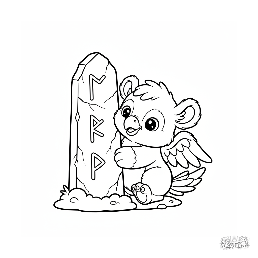 Ausmalbild für Kleinkinder: Ein flauschiger Baby-Greif lugt hinter einem uralten Runenmonolith hervor. Einfache Formen, breite Ränder.