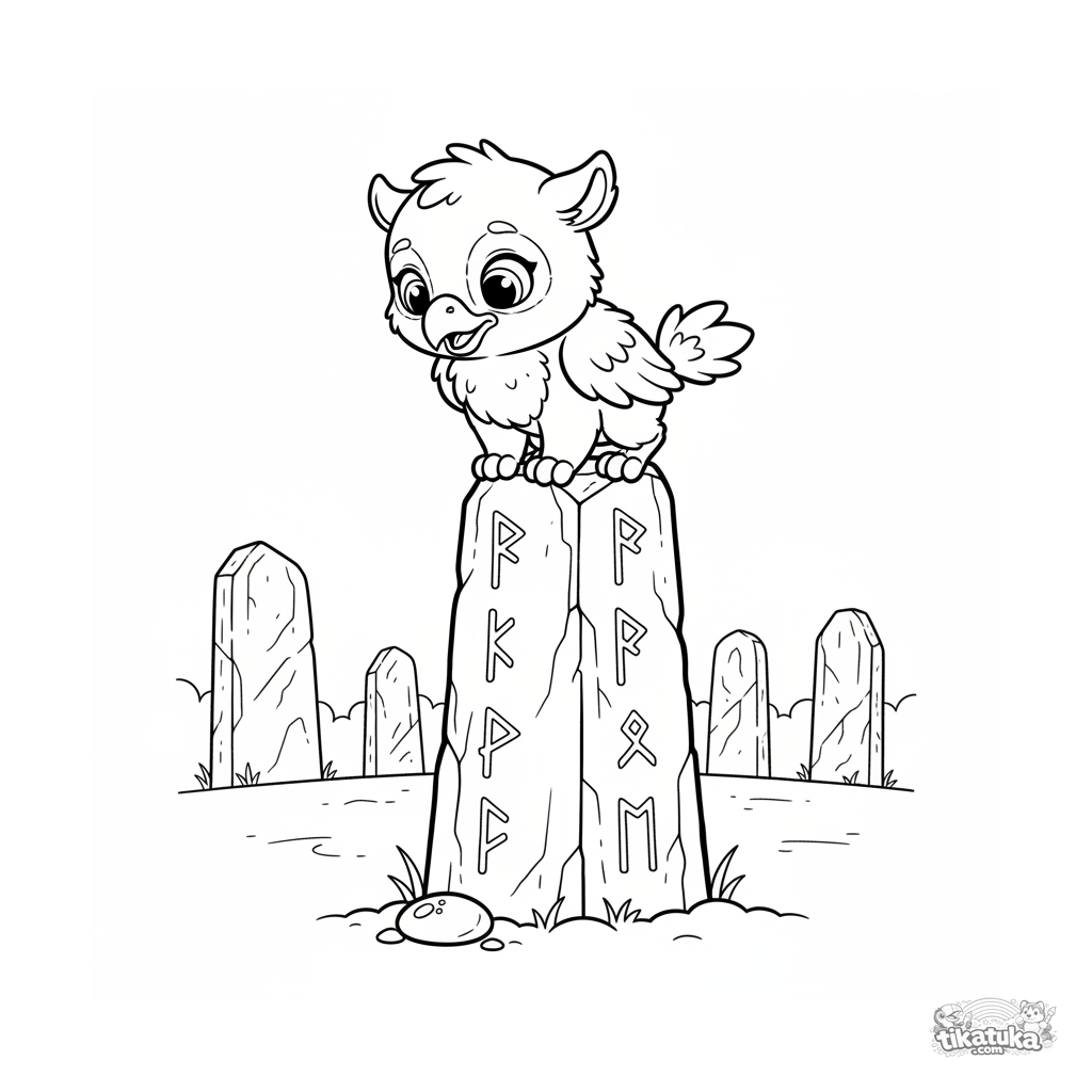 Ausmalbild für Kinder 4-6: Ein neugieriger Baby-Greif sitzt auf einem alten Runenmonolithen. Einfache Formen, freundlicher Charakter.