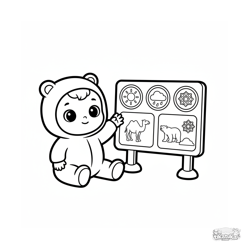 Ausmalbild für Kleinkinder 2-3: Ein Baby sitzt und erkundet große Wettersymbole an einem niedrigen Zooschild, verbunden mit Tierklimata. Einfache Szene zur ersten Einführung ins Wetter.