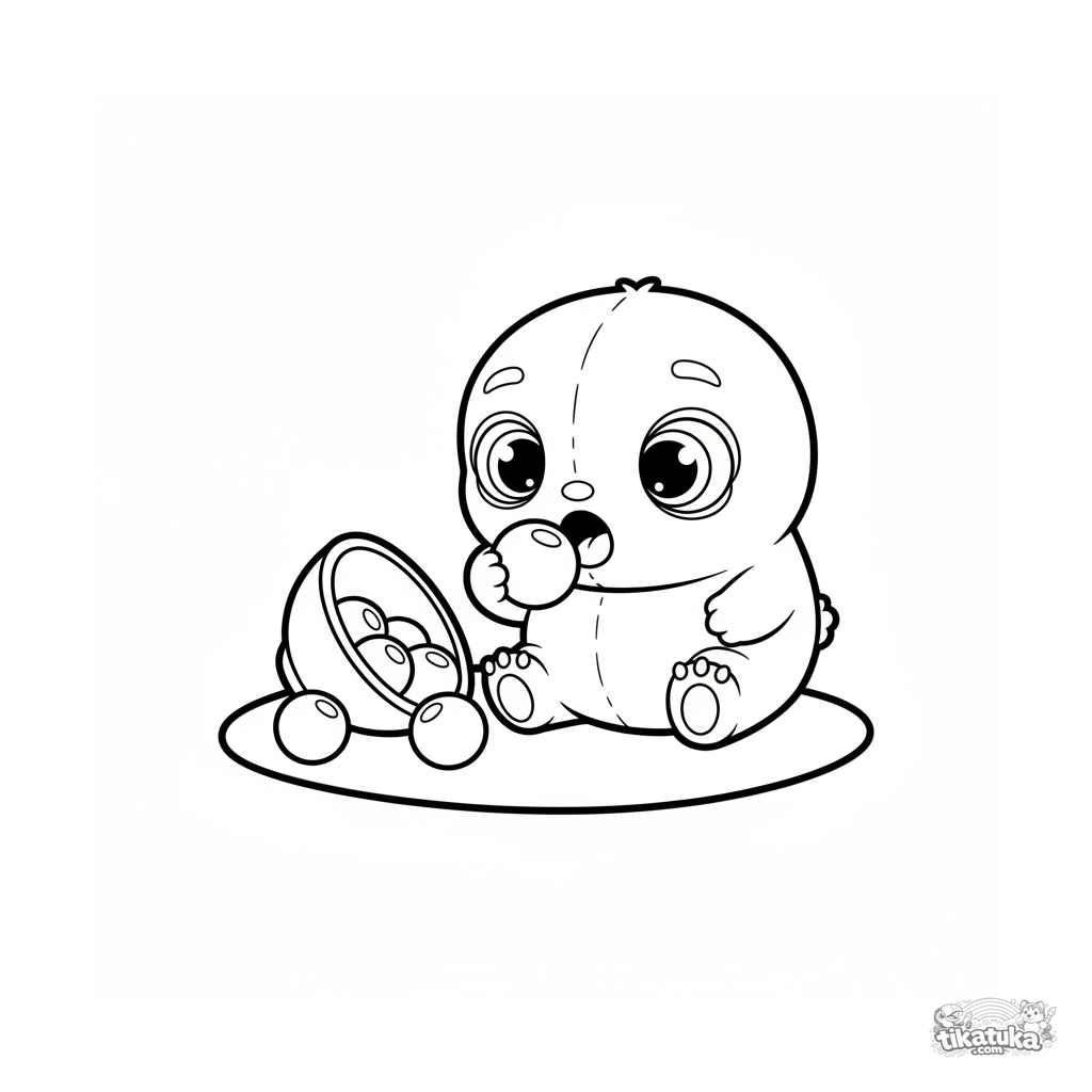 Sehr einfaches Kleinkind Ausmalbild 2-3: Ein Baby-Monster kostet eine Beere auf einem Picknick. Riesige weiße Ränder, eine große Figur.