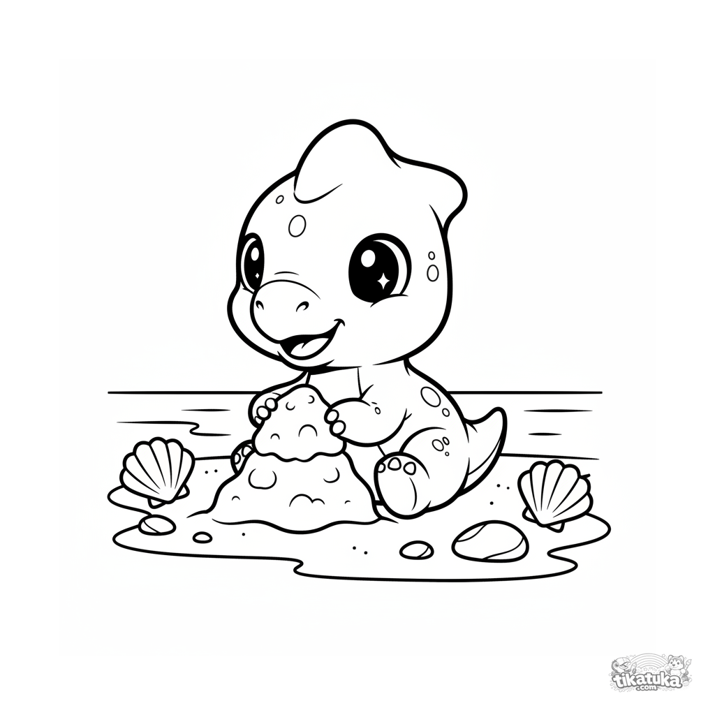 Ausmalbild für Kleinkinder 2-3: Ein Baby-Parasaurolophus baut eine Sandburg an einem uralten Meeresstrand. Einfache, große Formen mit breiten Rändern.