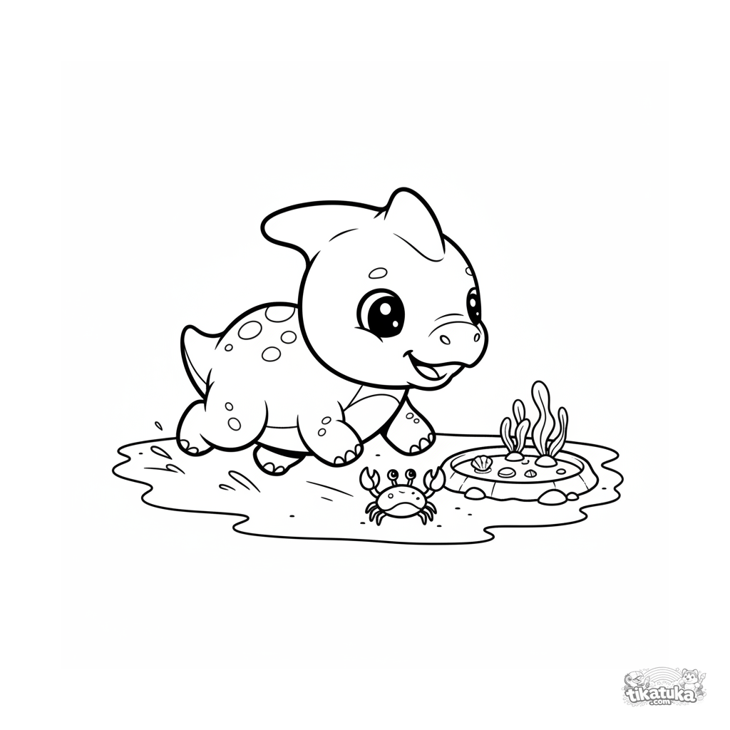 Einfaches Ausmalbild für Kleinkinder von 2-3 Jahren: Ein Baby-Parasaurolophus jagt einen kleinen Krebs an einem urzeitlichen Strand. Große Formen, wenige Details.