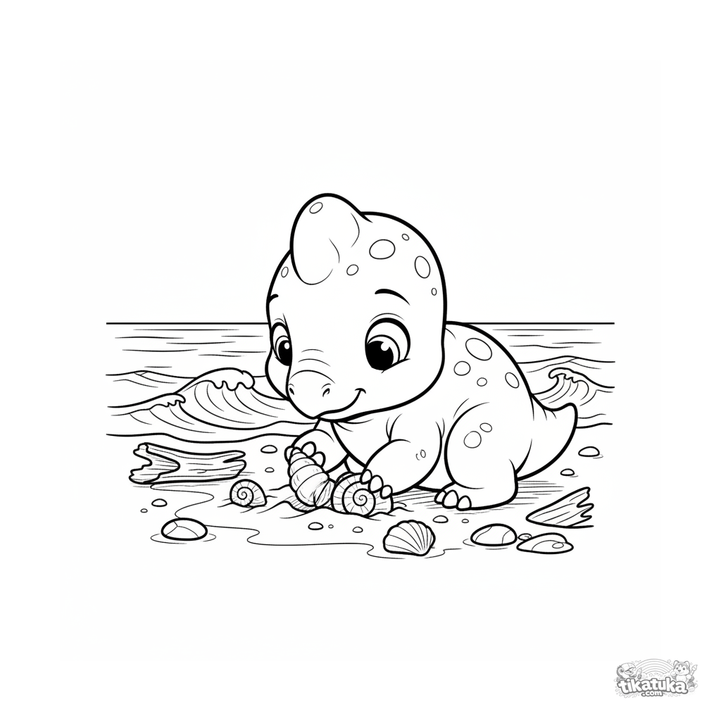 Ausmalbild für Kinder 4-6: Ein Baby-Parasaurolophus erkundet den Sandstrand eines uralten Ozeans und sucht nach Muscheln. Niedliche Szene zur Entwicklung der Feinmotorik.