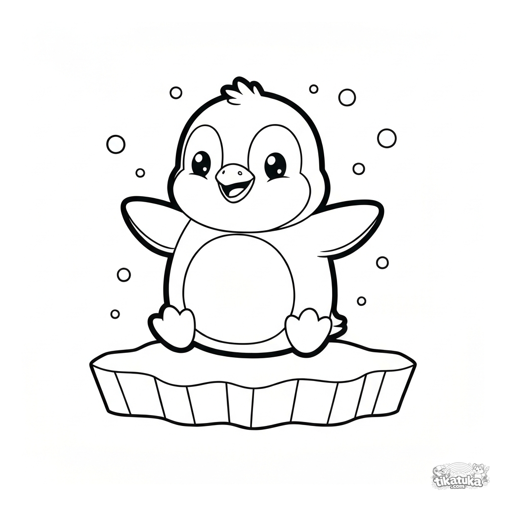 Niedliches Pinguin-Küken Ausmalbild für Kinder 2-5. Das Baby watschelt auf einer Eisscholle, das Bild hat große Formen und klares Thema.