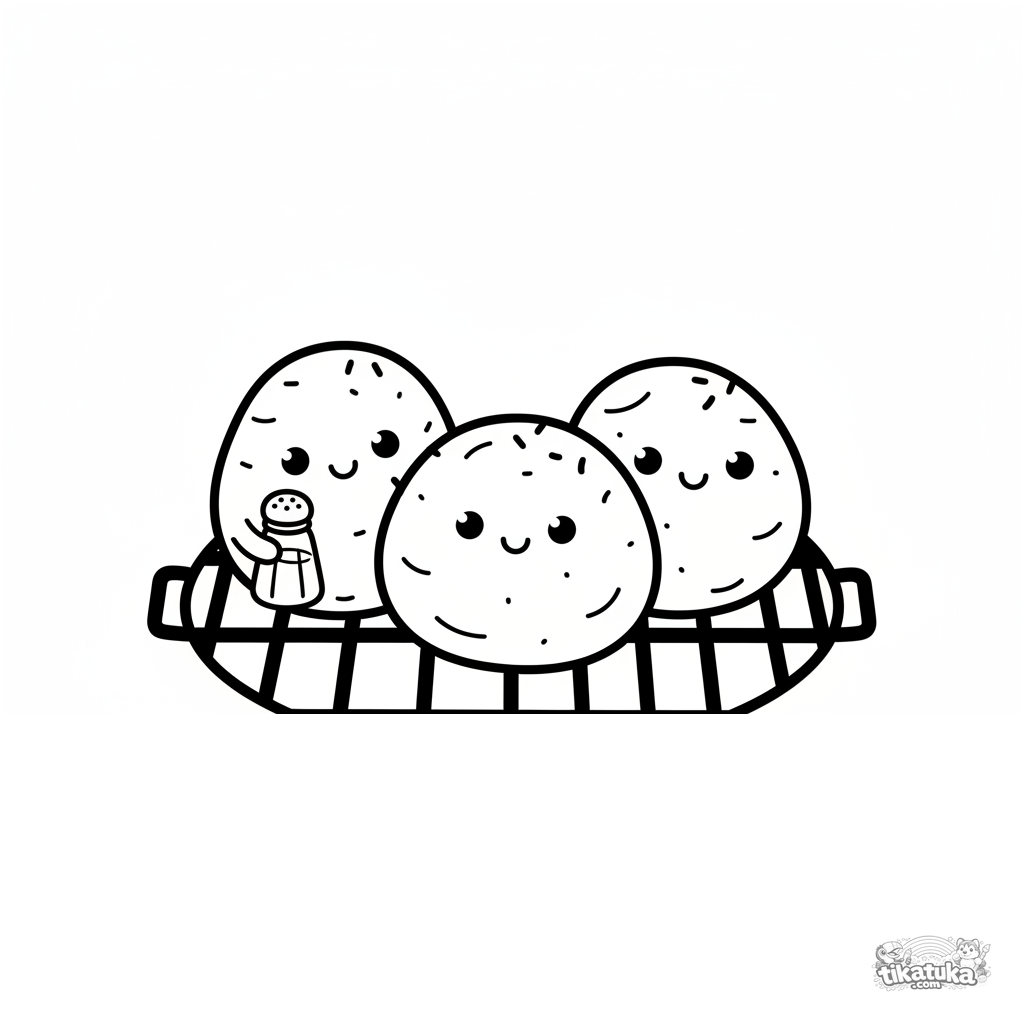 Sehr einfaches Ausmalbild für Kleinkinder von 2-3 Jahren: eine Familie von Babykartoffeln auf dem Grill. Große runde Formen, glückliche Gesichter, eine Kartoffel hält ein Salzstreuer.