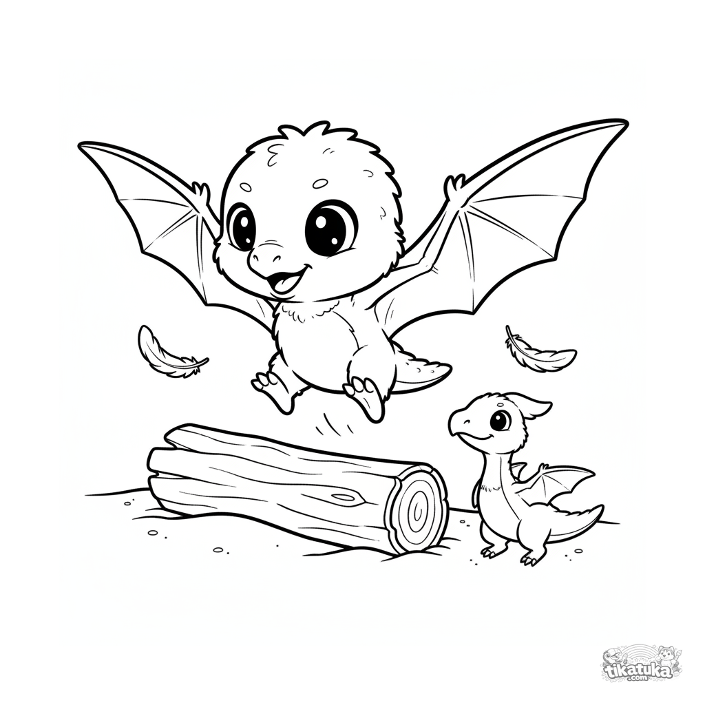 Einfaches Ausmalbild für Kleinkinder 2-3: Ein flauschiger Baby-Pterosaurus macht seinen ersten Flug von einem Baumstamm an einem urzeitlichen Strand.
