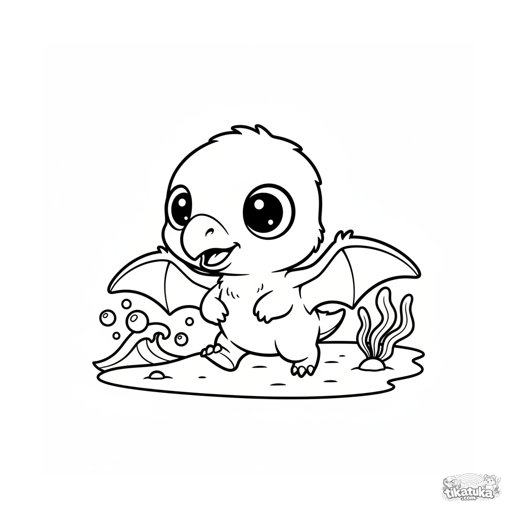 Einfaches Ausmalbild für Kleinkinder 2-3: ein süßer Baby-Pterosaurier macht seine ersten Schritte auf dem nassen Sand eines uralten Ozeans. Große Formen, wenige Details.