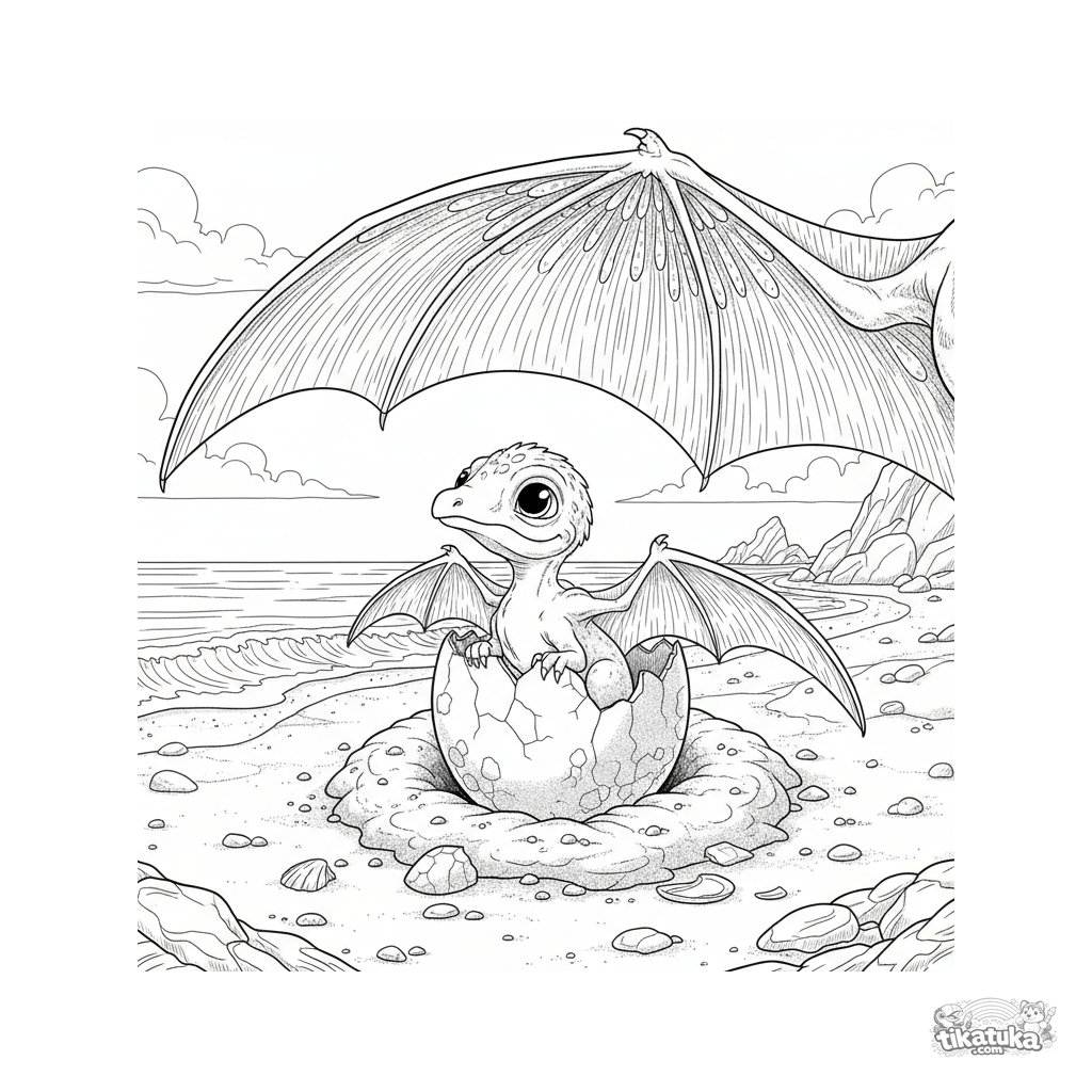 Ausmalbild für ältere Kinder 10-12: Ein Baby-Pterosaurier schlüpft an einem uralten Ozeanstrand. Realistischer Feldhandbuch-Stil, Ganzkörper, breite Ränder.