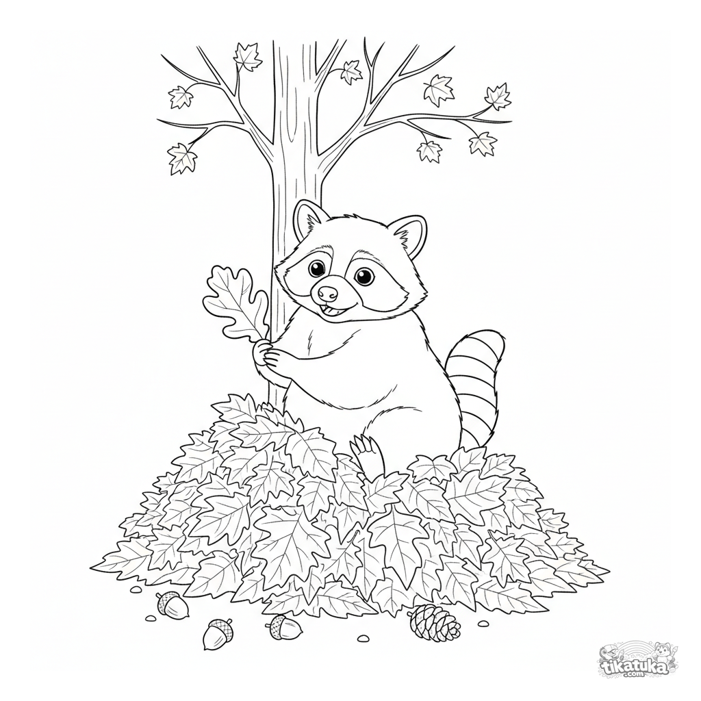 Ausmalbild eines Baby-Waschbären im Herbst. Für Kinder von 4-6 Jahren. Ein neugieriger Waschbär lugt aus einem Haufen bunter Blätter hervor.