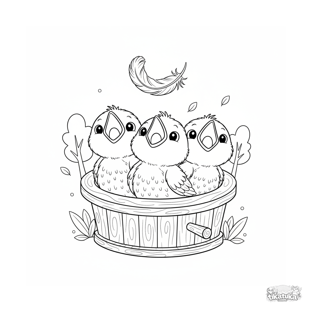 Ausmalbild für Kinder 4-6: drei flaumige Rotkehlchen-Küken warten im Holz-Vogelhaus auf die Eltern. Süße Szene im Aquarell-Skizzen-Stil.