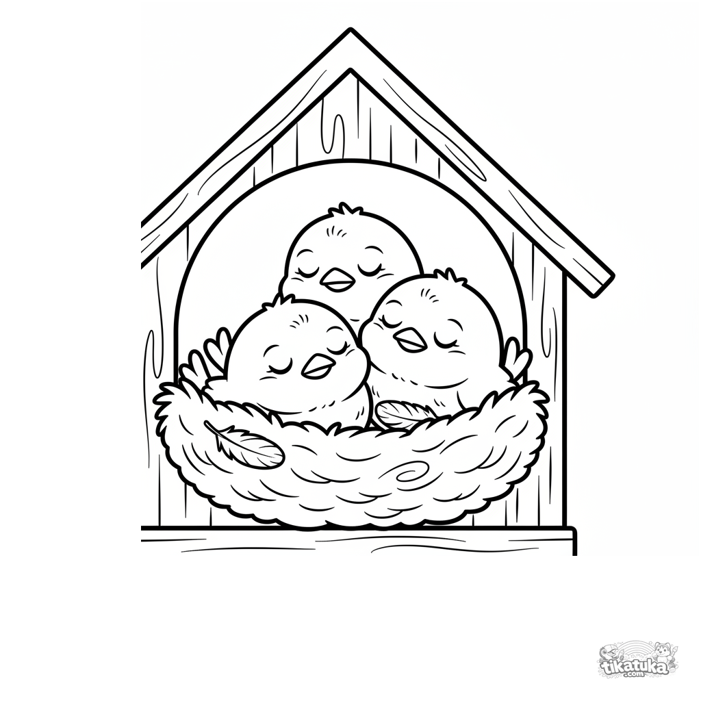 Einfaches Ausmalbild für Kleinkinder: drei flauschige Rotkehlchen-Küken schlafen friedlich in einem Nest in einem hölzernen Vogelhaus.