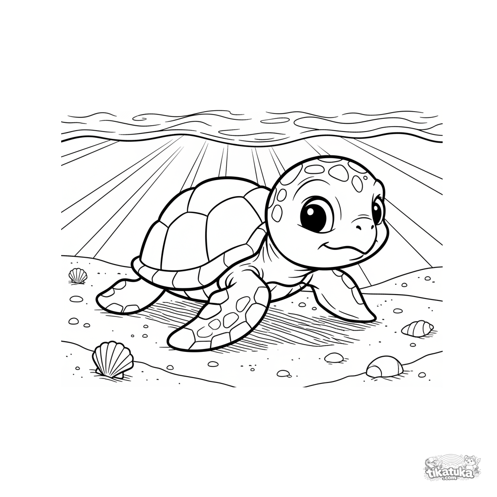 Ausmalbild für Kinder von 7 bis 9 Jahren: Eine Baby-Meeresschildkröte krabbelt über Sand zur sonnigen Oberfläche im flachen Wasser.