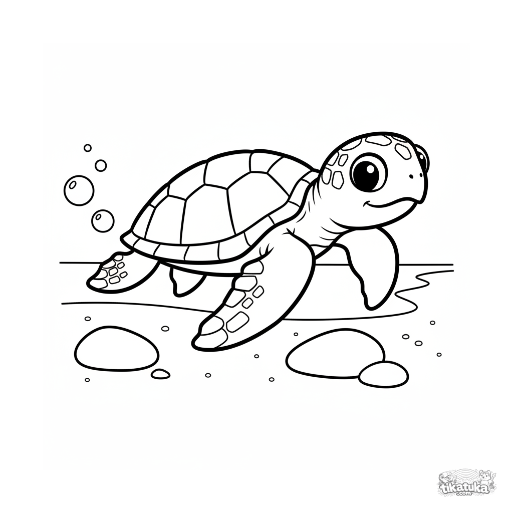 Einfaches Ausmalbild für Kleinkinder 2-3 Jahre: Eine Baby-Meeresschildkröte schwimmt in sonnigen Flachwassergebieten nahe einem Sandstrand.
