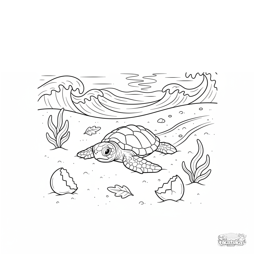 Realistisches Ausmalbild: Eine Baby-Meeresschildkröte schlüpft und krabbelt unter dem Mond zum Ozean. Für Kinder von 4 bis 6 Jahren.