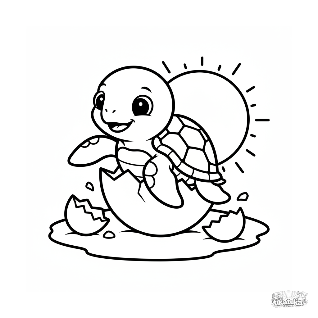 Einfaches Ausmalbild für Kleinkinder: Baby-Meeresschildkröte schlüpft auf einer sonnigen Sandbank. Große Formen, minimale Details, für 2-3 Jahre.