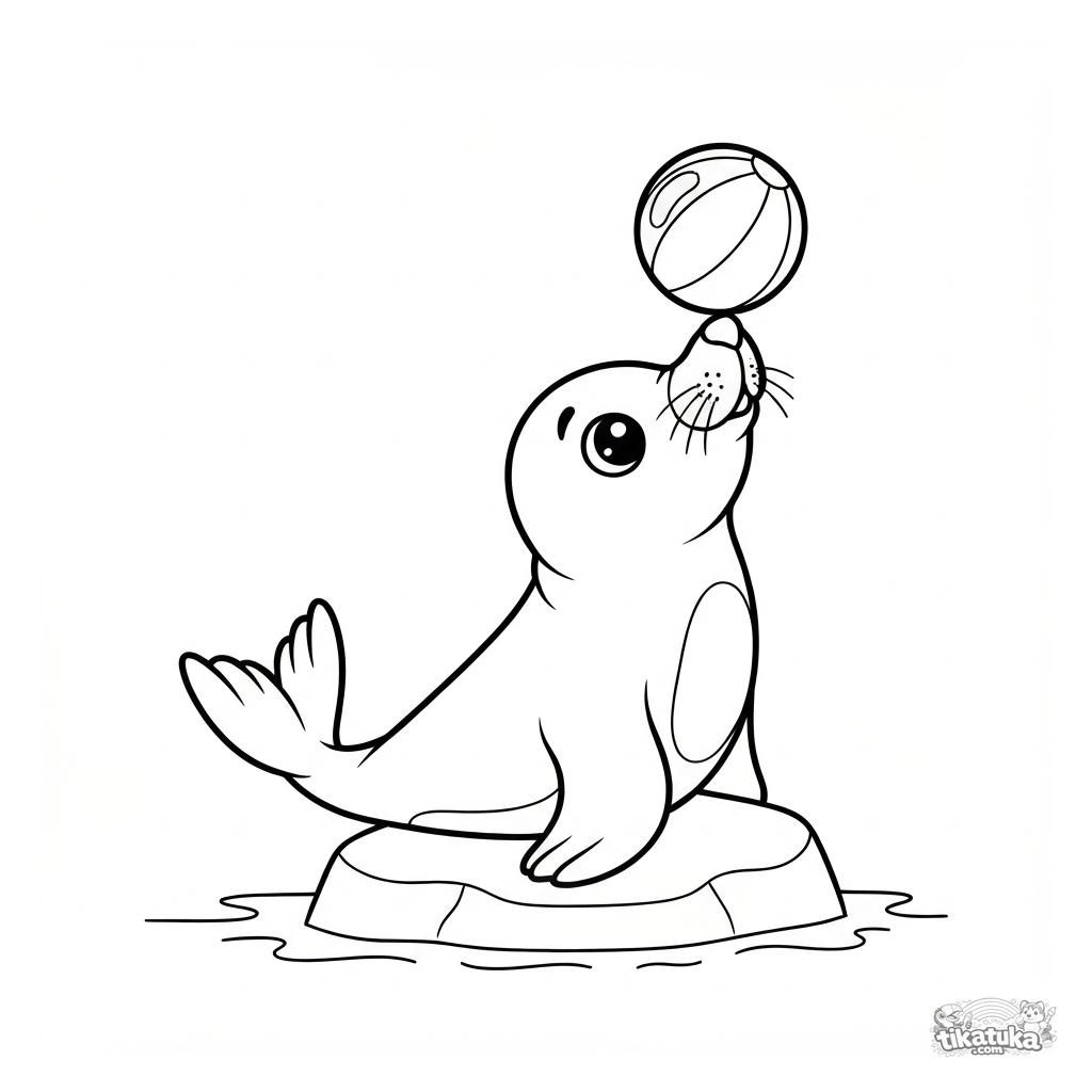 Ausmalbild für Kinder 3-5: Ein Baby-Seehund balanciert einen Ball auf der Nase. Lustiges Thema mit minimalem Hintergrund für einfaches Ausmalen.