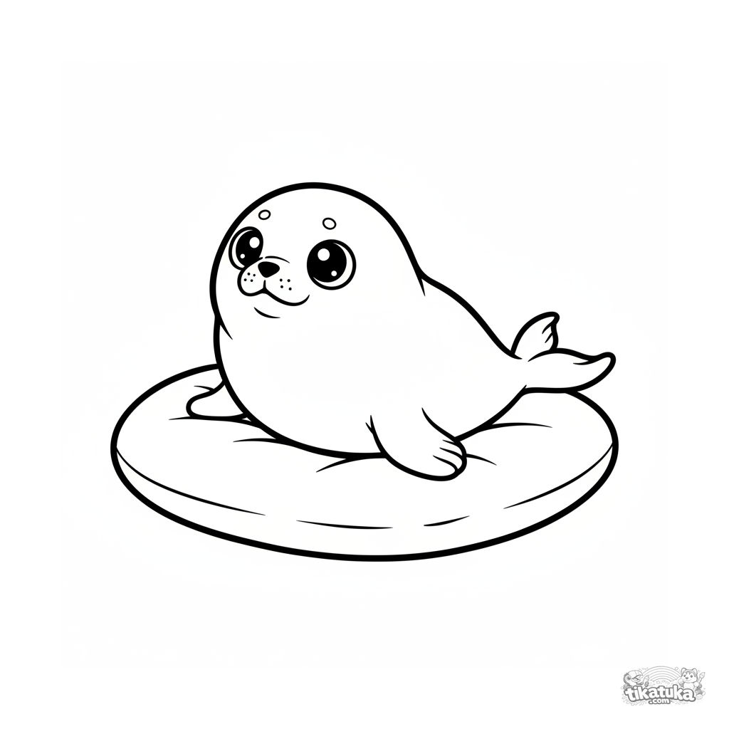 Kostenloses Ausmalbild für Kleinkinder 2-3 Jahre: ein süßes Plüsch-Baby-Robbe liegt auf einem Kissen. Riesige weiße Ränder, eine große Figur.
