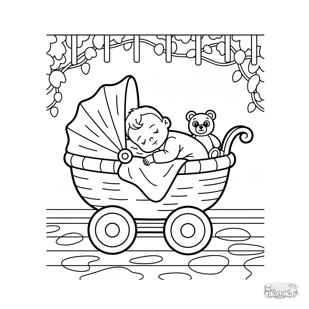 Sehr einfaches Ausmalbild für Kleinkinder: Ein Baby schläft im Kinderwagen im Schatten. Große geschlossene Formen, kaum Hintergrund, breite Ränder.