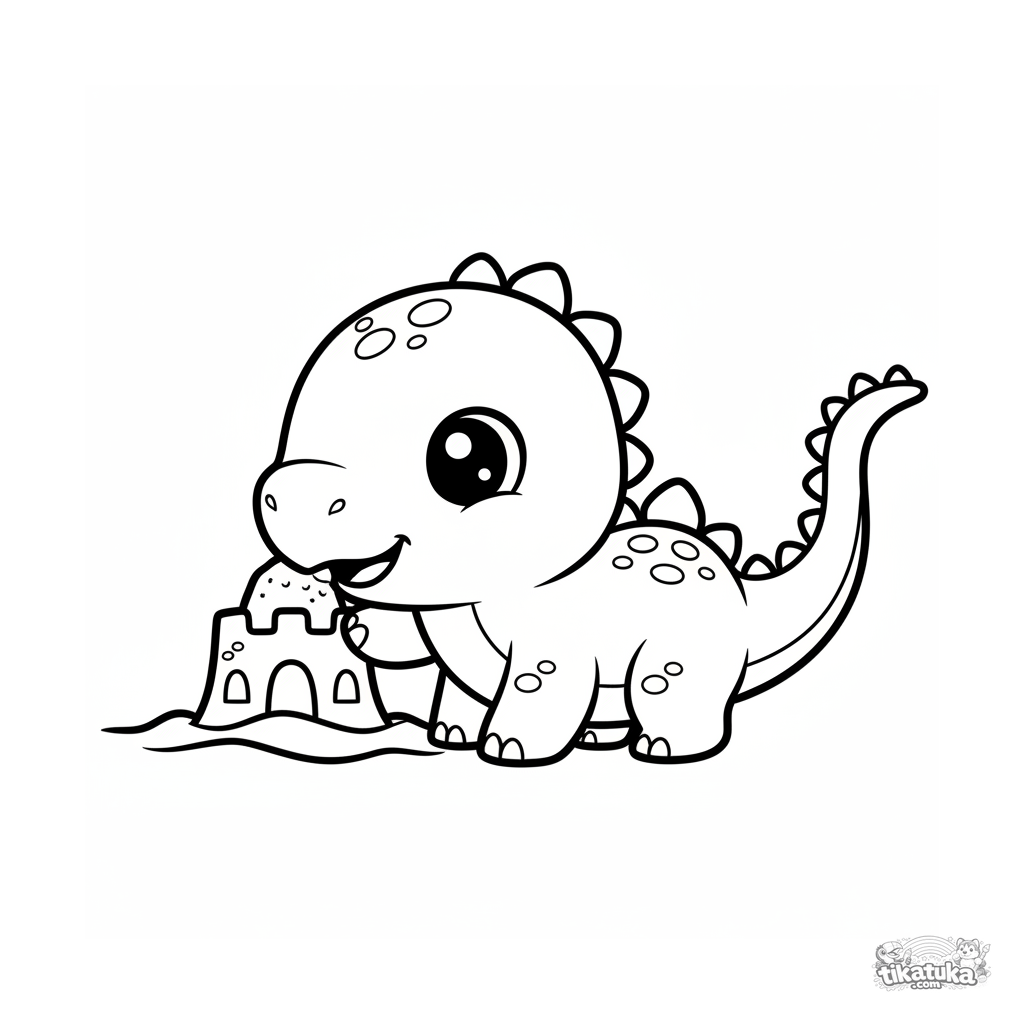 Ausmalbild für Kleinkinder 2-3: Ein Baby-Stegosaurus baut eine Sandburg am Ufer eines urzeitlichen Ozeans.