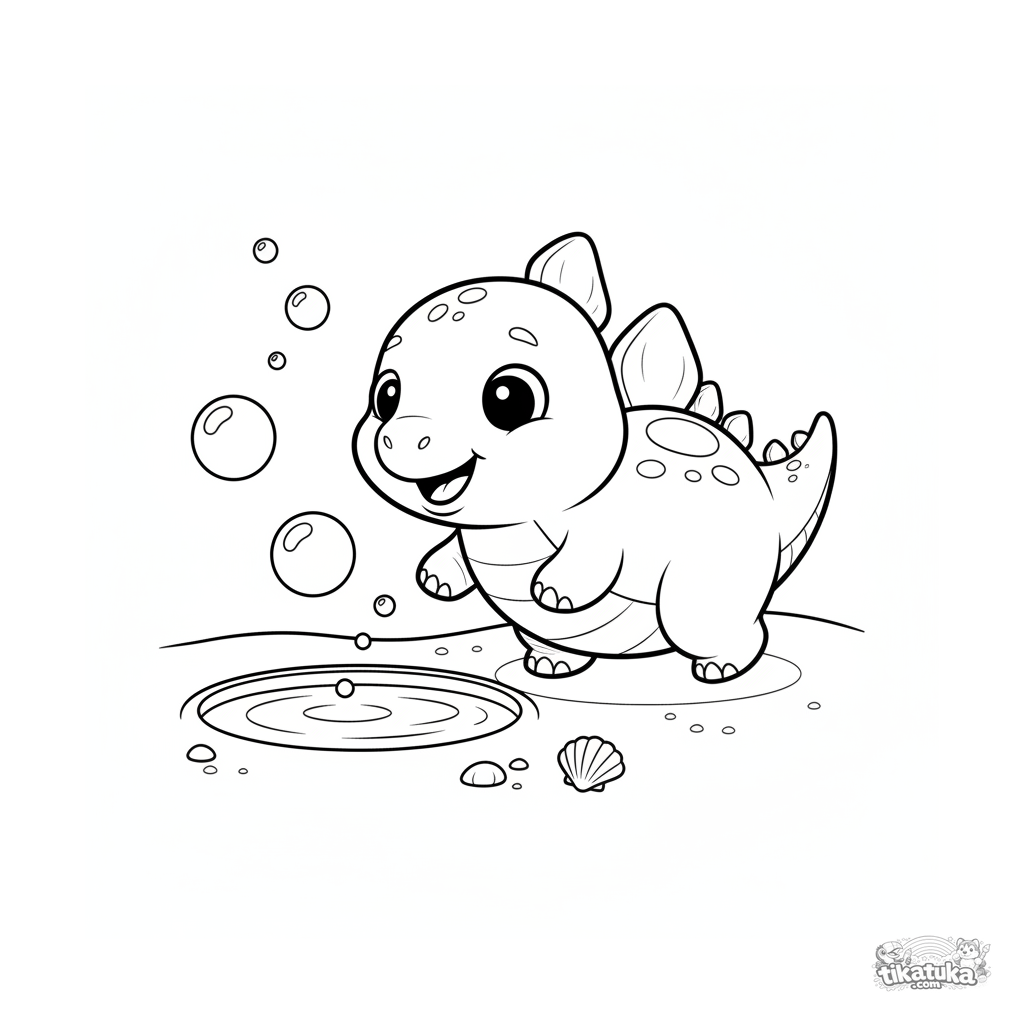 Einfaches Ausmalbild für Kleinkinder 2-3: Ein Stegosaurus-Baby jagt Blasen aus einer Gezeitenpool am uralten Strand. Große, klare Formen, minimale Details.