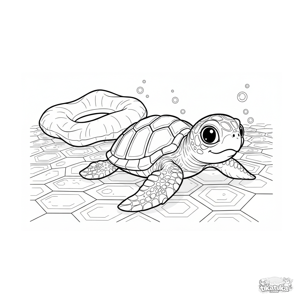 Ausmalbild für Kinder 7-9: Eine Babyschildkröte erkundet die gemusterten Fliesen am Beckenboden in der Nähe eines leeren Rings. Mäßiges Detail, pädagogisches Thema.