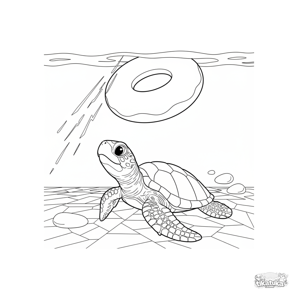 Detailliertes Ausmalbild für 10-12 Jahre: Eine Babyschildkröte krabbelt auf Fliesen am Poolboden und schaut zu einem Schwimmring an der Oberfläche. Realistische Linien, Lichtspiel.