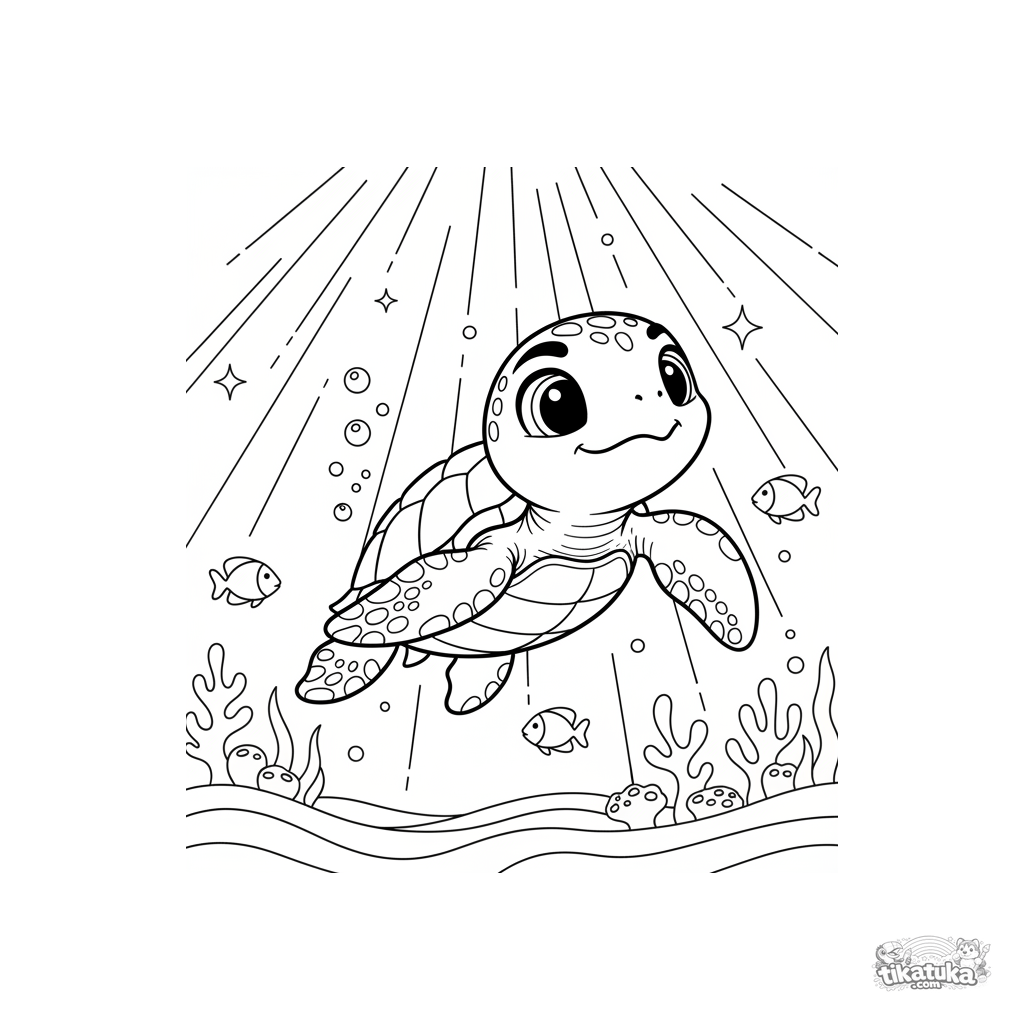 Ausmalbild für Kinder 7-9: Eine frisch geschlüpfte Baby-Meeresschildkröte schwimmt in einem Sonnenstrahl zur Oberfläche im flachen Wasser.