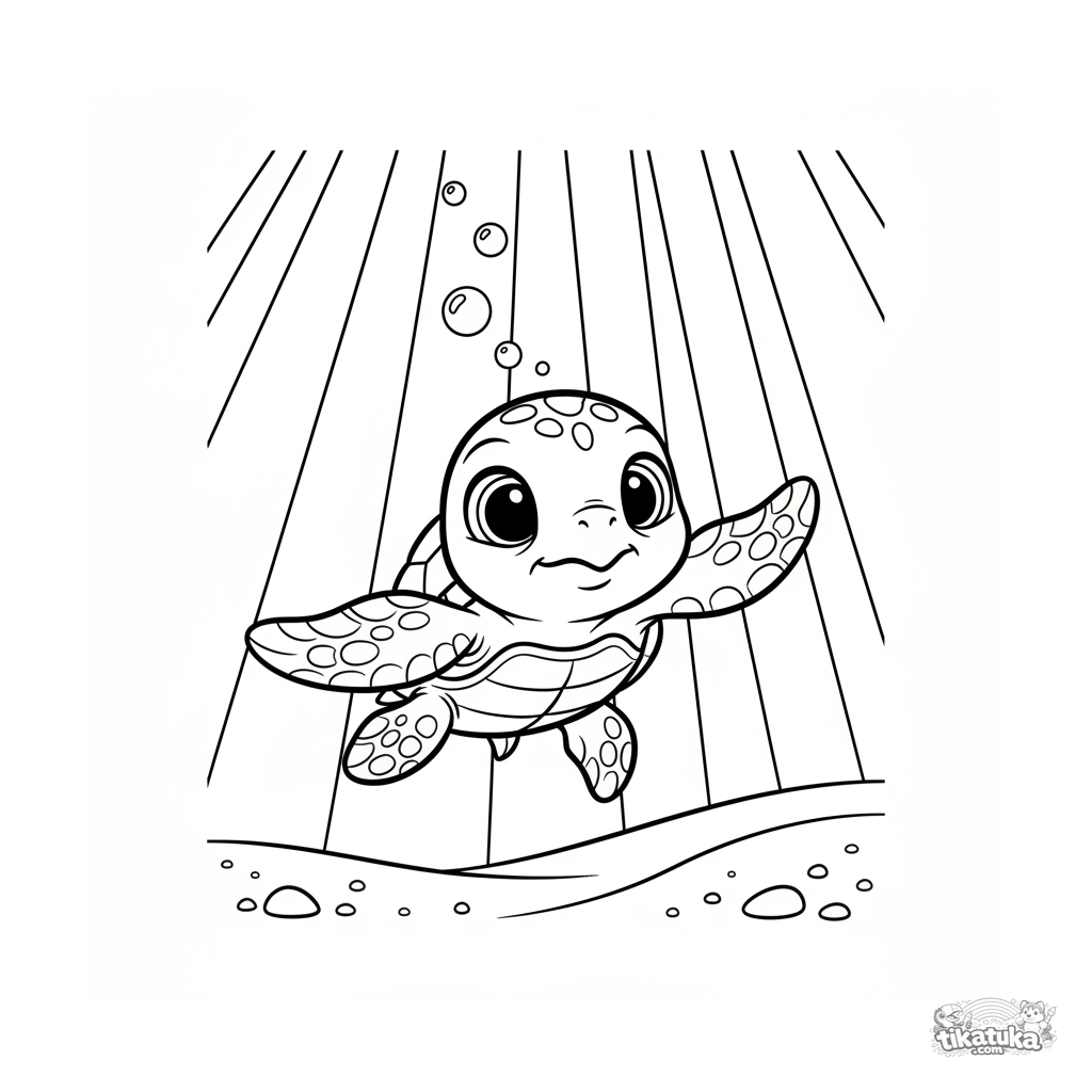 Ausmalbild einer Baby-Meeresschildkröte, die im Sonnenlicht zur Oberfläche schwimmt. Für Kinder von 7-9 Jahren.