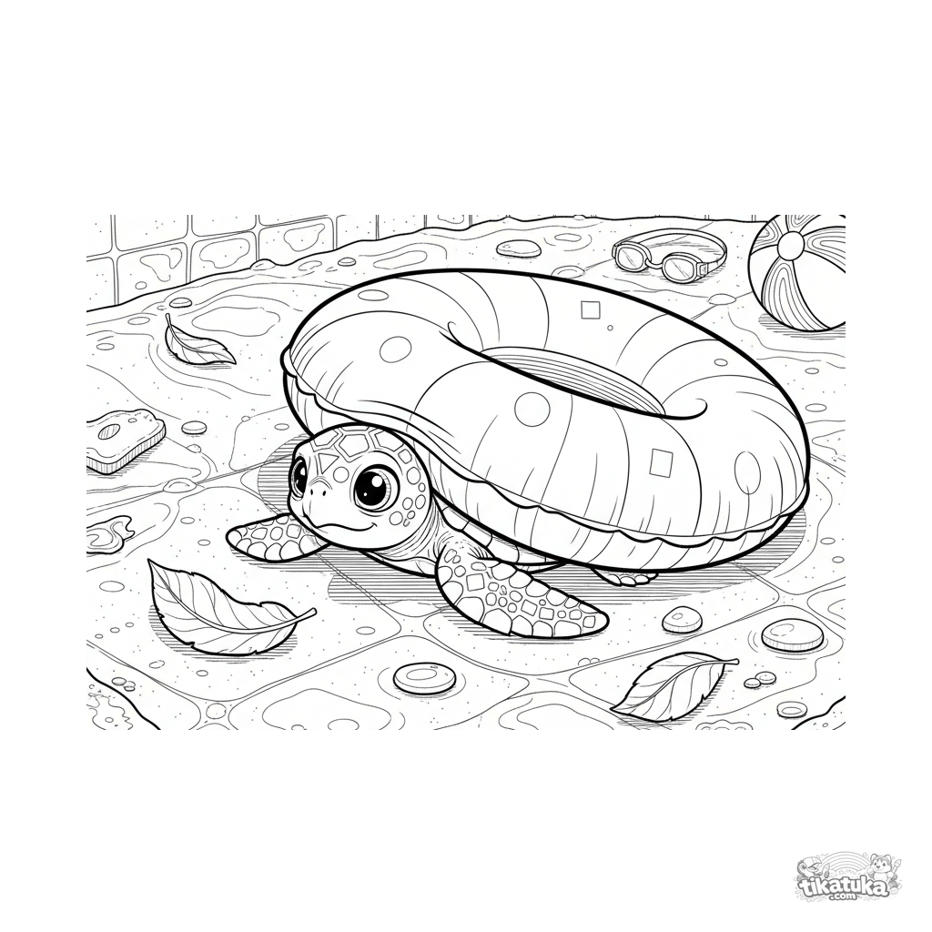 Detailliertes Ausmalbild für ältere Kinder 10-12: Eine kleine Baby-Schildkröte mit naturalistischen Merkmalen lugt unter einem Schwimmreifen am Poolboden hervor. Panzermuster und Texturen.